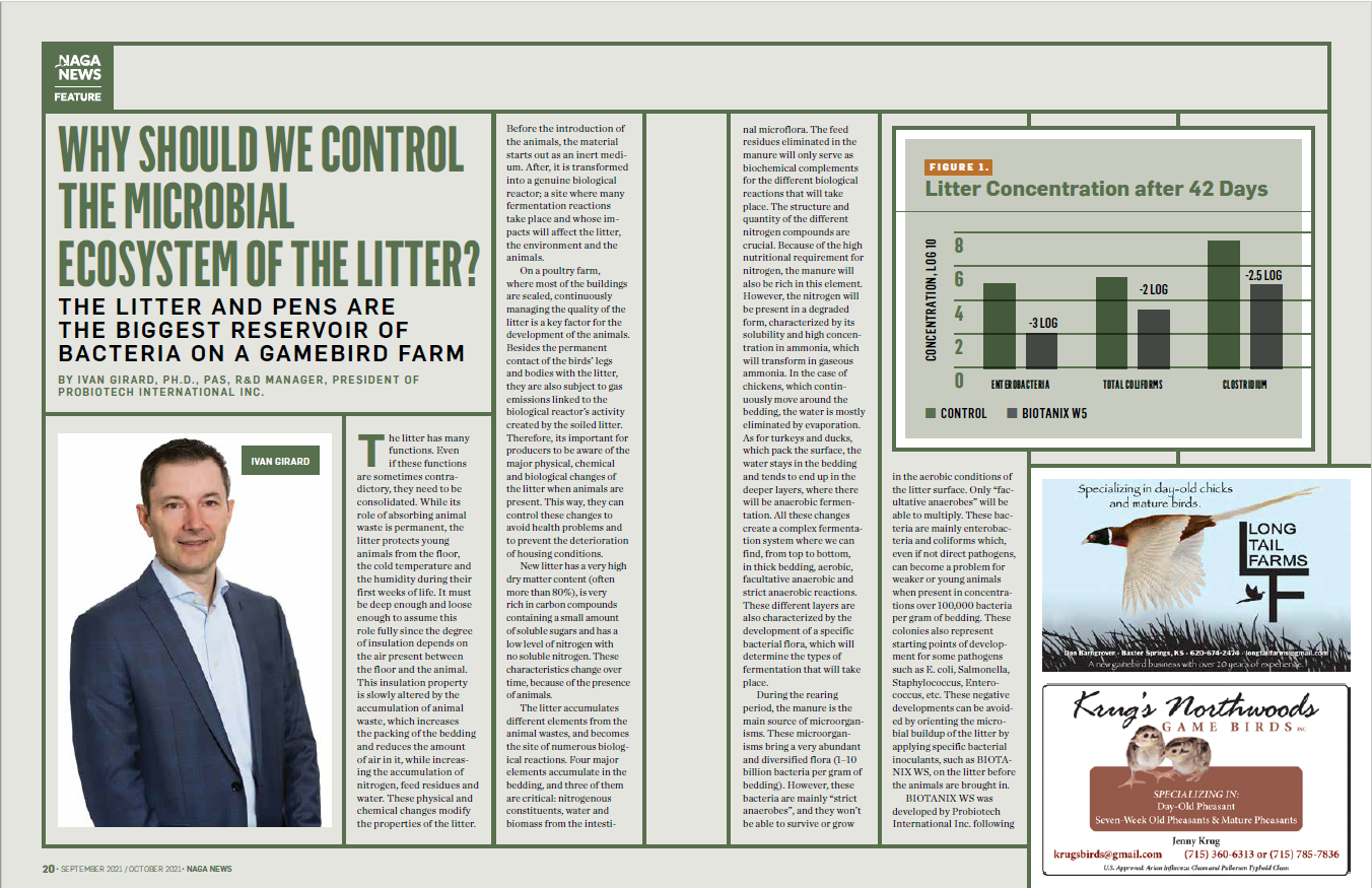 (York, Pa., October 7, 2021) York Ag, a dynamic supplier of holistic ingredient solutions that optimize animal well-being, shared that one of its partners of choice in natural ingredients, Probiotech, was featured in the September/October 2021 issue of the North American Gamebird Association’s NAGA News Magazine. The article titled “Why Should We Control the Microbial Ecosystem in the Litter?”, written by Ivan Girard, PH.D., PAS, R&D Manager, and President of Probiotech International Inc., covered why the litter and pens are the biggest reservoir of bacteria in a gamebird farm, and how these negative developments can be avoided by applying specific bacterial inoculants, such as BIOTANIX® WS.